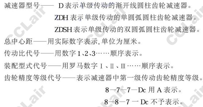 在減速器的代號中,包括減速器的型號,總中心距,傳動比,裝配型式及齒輪精度等級.