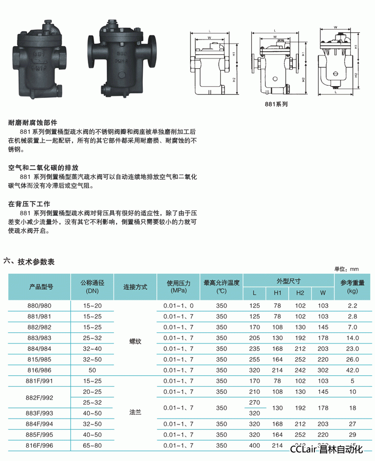 880F,881F,882F,883F,884F,885F,816F,倒置桶式蒸汽疏水閥