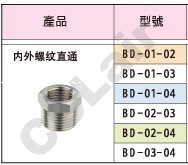 BD-01-02,BD-01-03,BD-01-04,BD-02-03,BD-02-04,BD-03-04,國(guó)鷹KUOIN內(nèi)外螺紋直通接頭