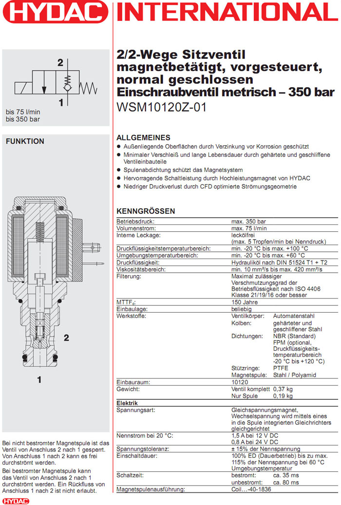 首頁 > 產(chǎn)品&解決方案 > WSM10120Z-01-C-N-24DG,WSM10120Z-01-C-N-230AG,HYDAC電磁2/2方向座閥