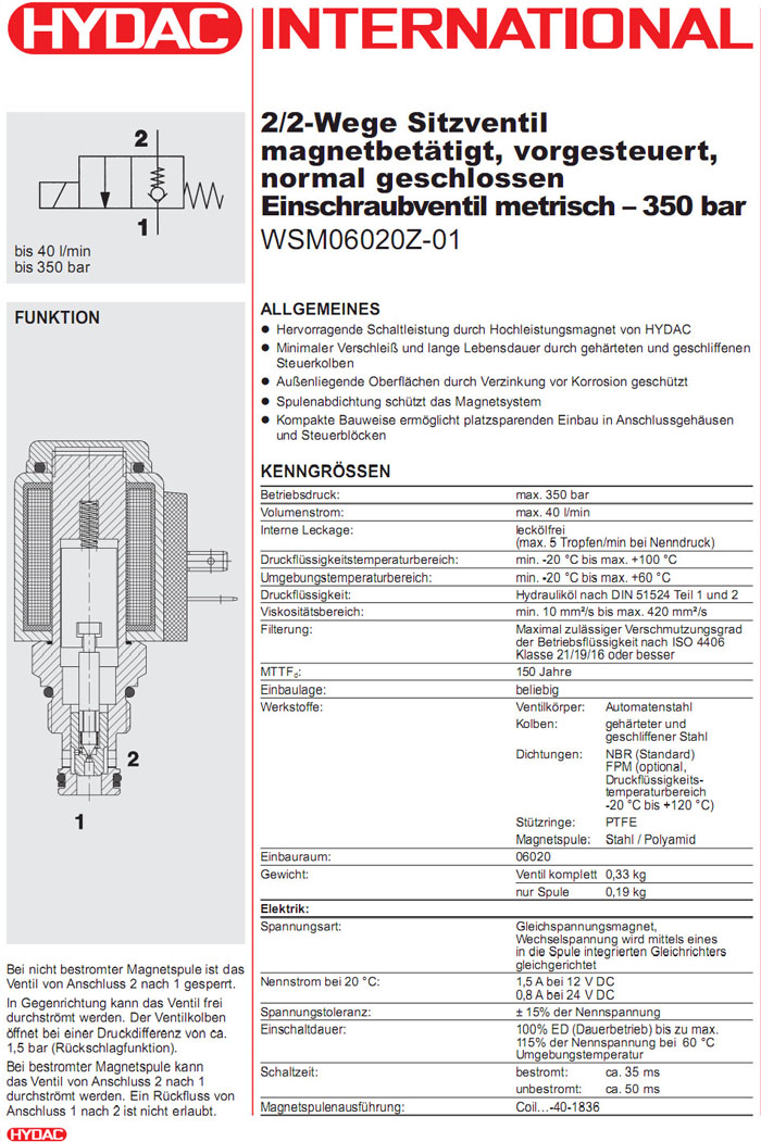 首頁 > 產(chǎn)品&解決方案 > WSM06020Z-01-C-N-24DG,WSM06020Z-01-C-N-230AG,HYDAC電磁2/2方向座閥