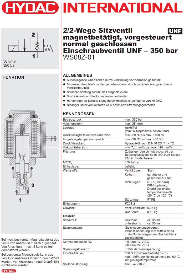 WS08Z-01-C-N-24DG,WS08Z-01-C-N-230AG,HYDAC電磁2/2方向座閥