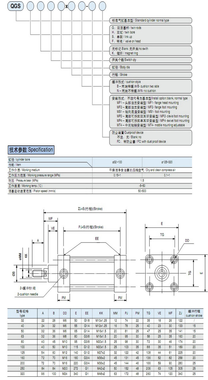 QGSH32,QGSH40,QGSH50,QGSH63,QGSH80,QGSH100,QGSH125,QGSH160,QGSH200,QGSH250,QGSH320,標(biāo)準(zhǔn)氣缸