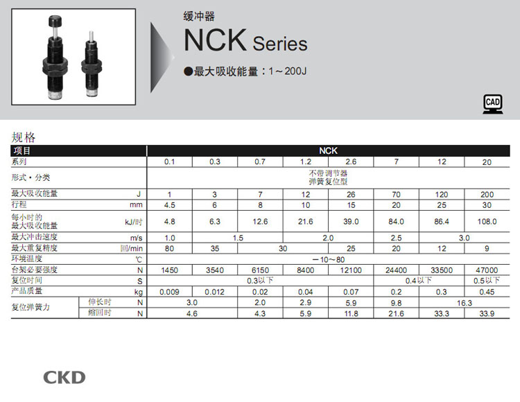 詳細(xì)信息 NCK-FA-0.1,NCK-FA-0.3,NCK-FA-0.7,NCK-FA-1.2,NCK-FA-2.6,NCK-FA-7,NCK-FA-12,NCK-FA-20,CKD緩沖器