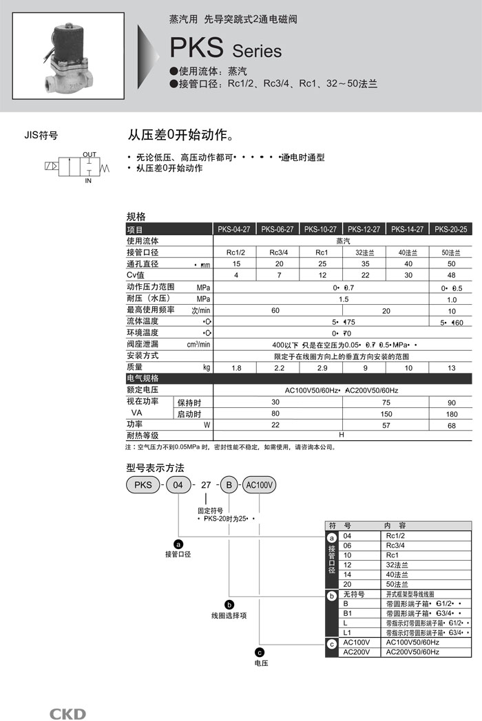 PKS-04-27,PKS-06-27,PKS-10-27,PKS-12-27,PKS-14-27,PKS-20-25,CKD先導式2通電磁閥