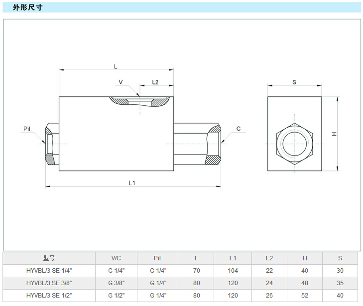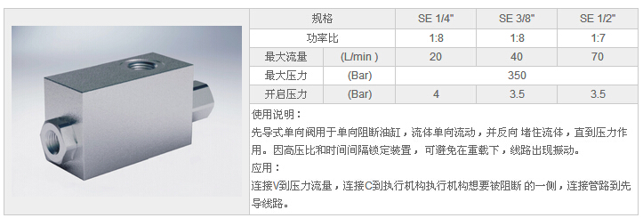 HYVBL/3 SE 1/4",HYVBL/3 SE 3/8",HYVBL/3 SE 1/2",單先導(dǎo)式單向閥