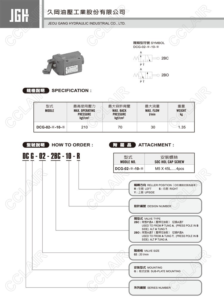 JeouGang臺灣久岡,凸輪行程換向閥DCG-02-2BC-10-R,DCG-02-2BC-10-S,DCG-02-2BC-10-Y,DCG-02-2BO-10-R,DCG-02-2BO-10-S,DCG-02-2BO-10-Y
