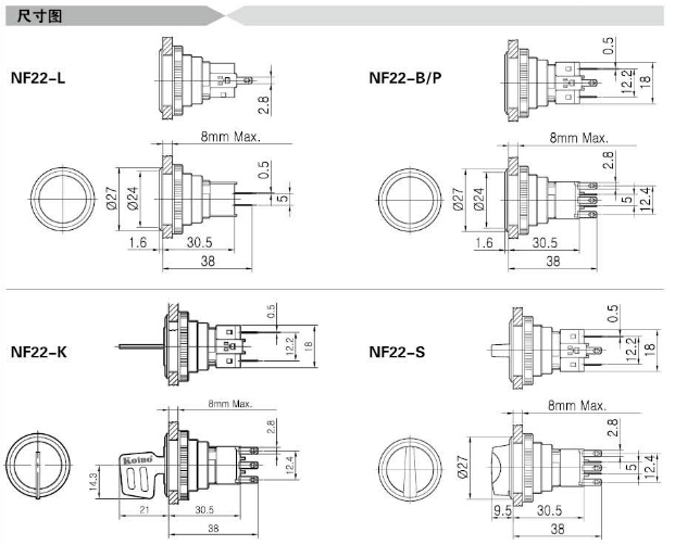 NF22-L,NF22-B/P,NF22-K,NF22-S,Koino Φ22平面型控制開關(guān)