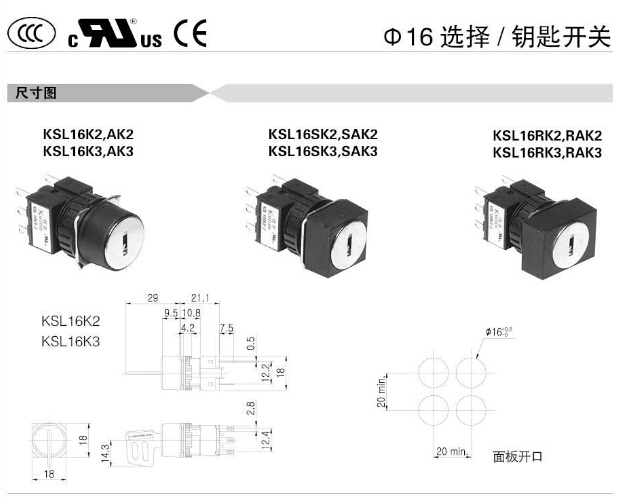 KSL16K2,KSL16AK2,KSL16K3,KSL16AK3,KSL16SK3,KSL16SAK3,KSL16RK2,KSL16RAK2,KSL16RK3,KSL16RAK3,KoinoΦ16鑰匙開關(guān)