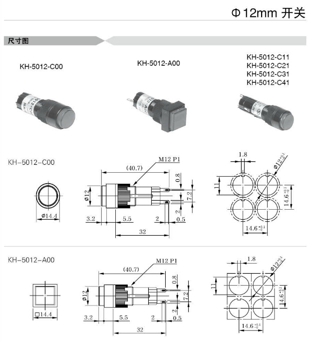 KH-5012-C00,KH-5012-C11,KH-5012-C21,KH-5012-A00,KH-5012-A11,KH-5012-A21,Koino Φ12mm開關(guān)