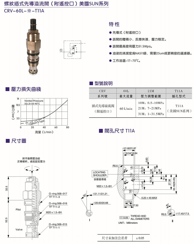 CRV-60L-10M-T11A,CRV-60L-21M-T11A,CRV-60L-31M-T11A,螺紋插式先導溢流閥