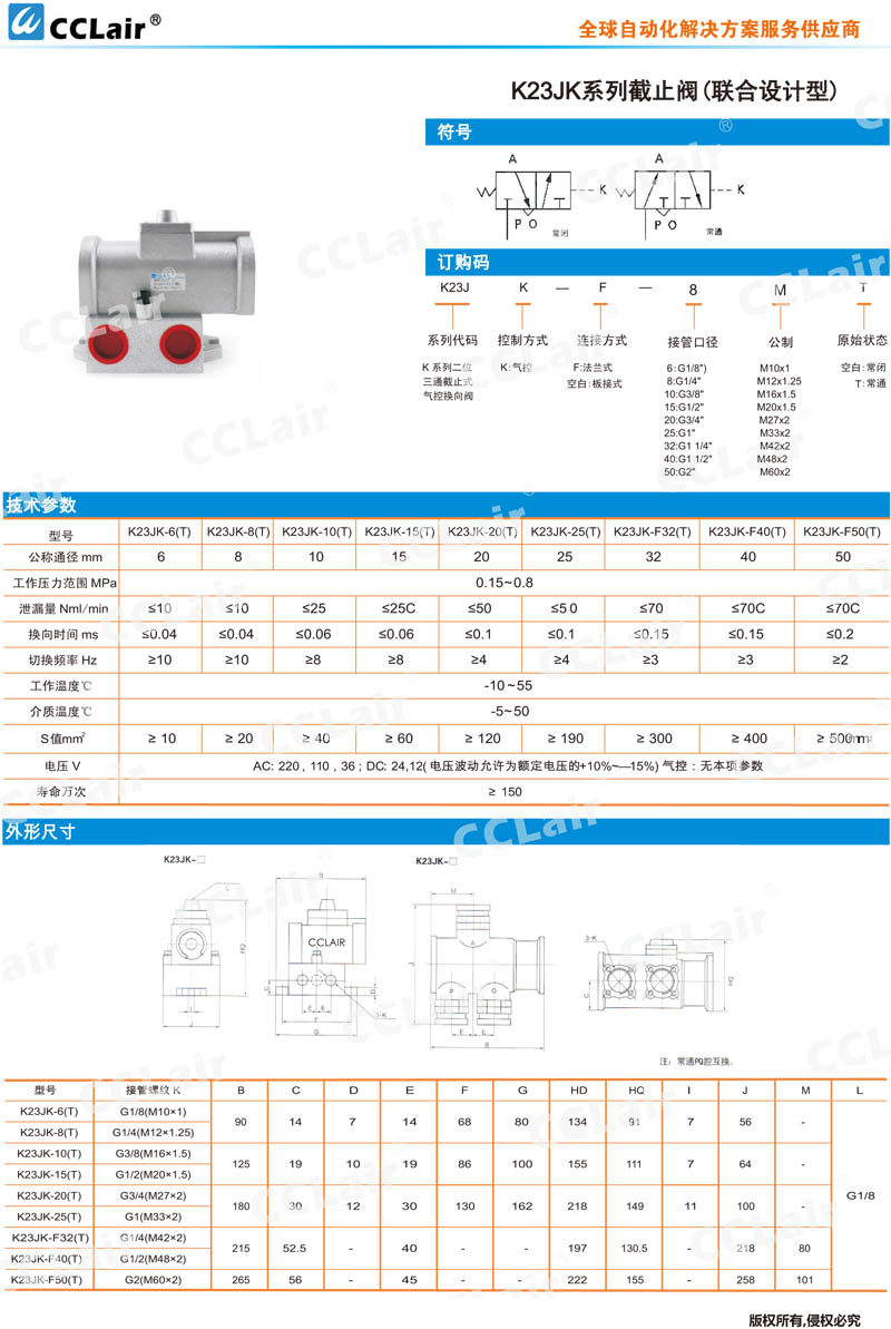 首頁 > 產(chǎn)品&解決方案 > K23JK-6,K23JK-8,K23JK-10,K23JK-15,K23JK-F32,K23JK-15T,K23JK-F40,K23JK-F50T,二位三通截止式氣控?fù)Q向閥