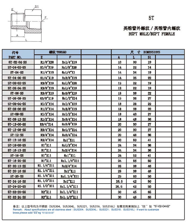 5T-02-04-SS,5T-04,5T-06,5T-08,5T-12,5T-20,5T-24,5T-32,直通內(nèi)外絲接頭