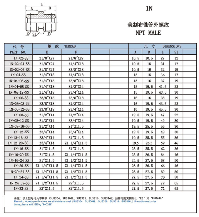 1N-06-12-SS,1N-08-SS,1N-08-12-SS,1N-08-16-SS,1N-12-SS,1N-12-16-SS,1N-12-20-SS,1N-16-SS,