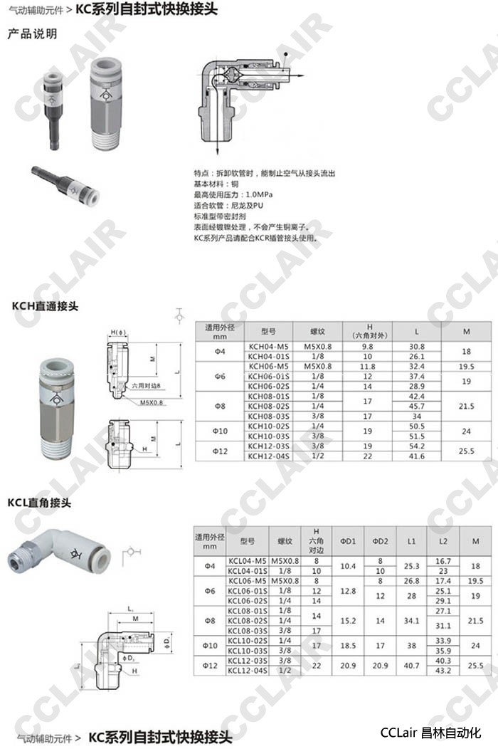 KCL04,KCL06,KCL08,KCL10,KCL12,自封式快換接頭
