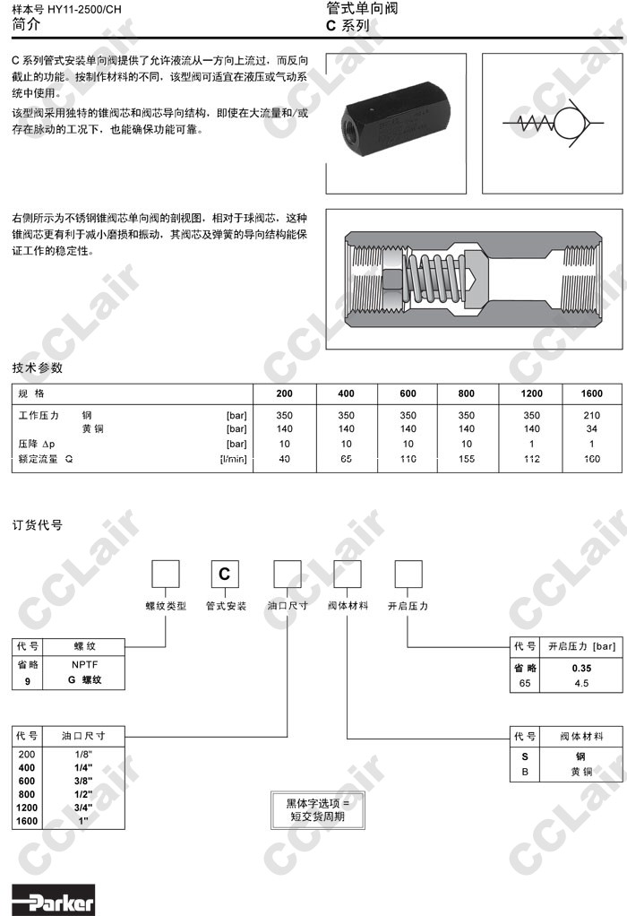 C200S,C400S,C800S,C1200S,C1600S,C200B,C400B,C800B,C1200B,C1600B,Parker管式單向閥