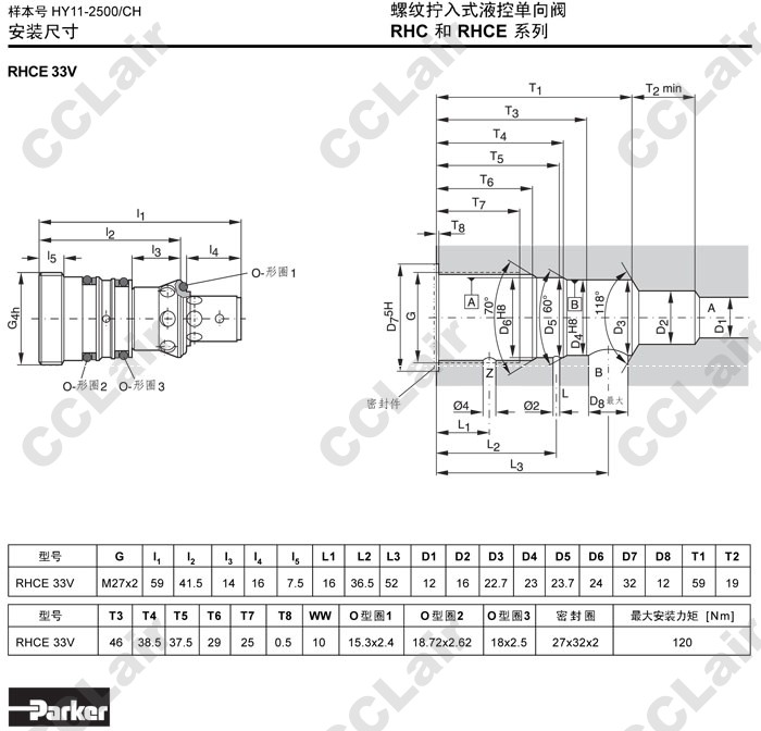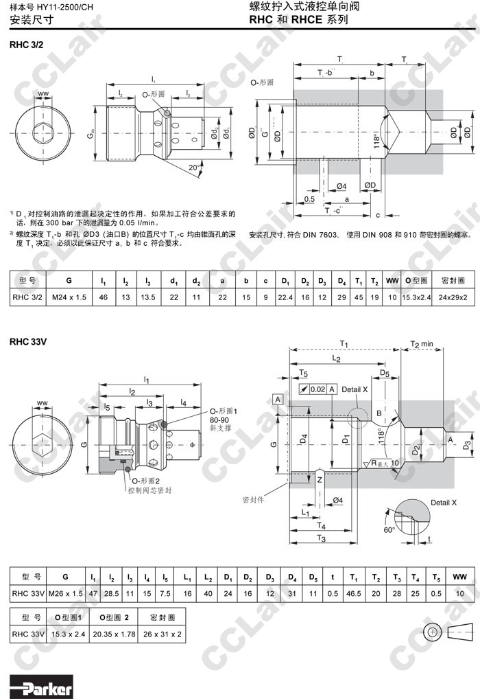 詳細信息 RHC3/2,RHC33V,RHCE33V,Parker螺紋擰入式液控單向閥