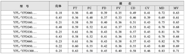 4. 額定流量下的清潔濾芯壓降(單位:1×105Pa 介質(zhì)參數(shù):30cst 0.86kg/dm3)