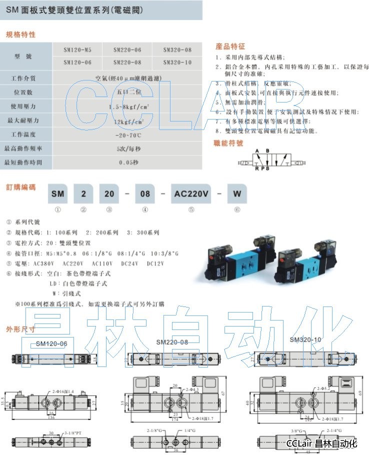 SM120-M5,SM120-06,SM120-10,SM220-M5,SM220-08,SM320-08,面板式雙頭雙位電磁閥