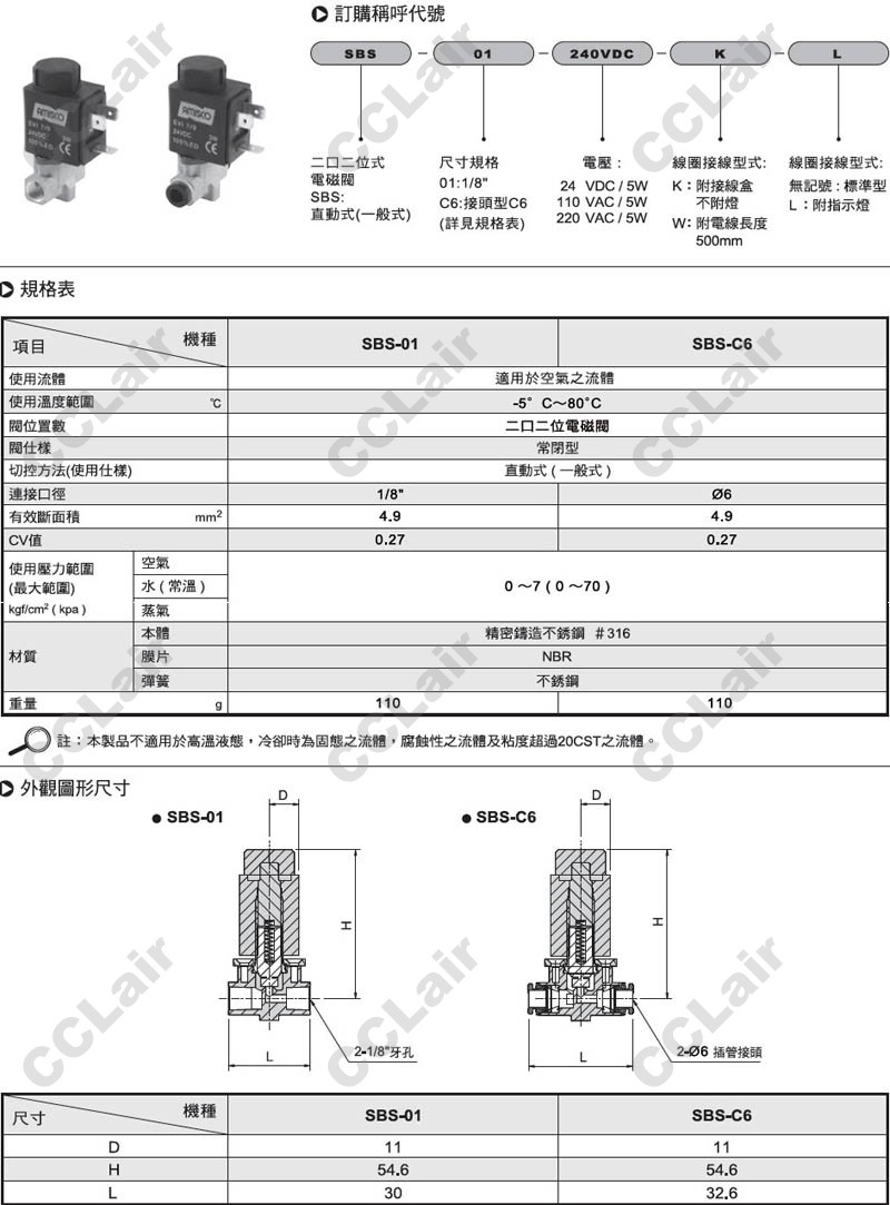 氣立可(chelic),SBS-01-24VDC-K,SBS-C6-24VDC,SBS-01-110VAC,SBS-C6-110VAC,SBS-01-220VAC,電磁閥