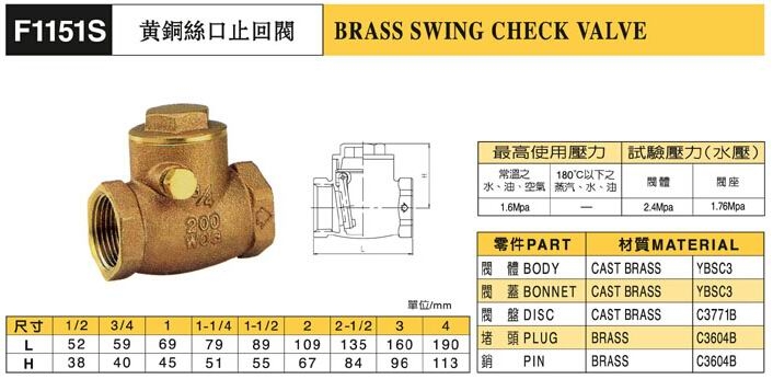 F1151S黃銅止回閥尺寸