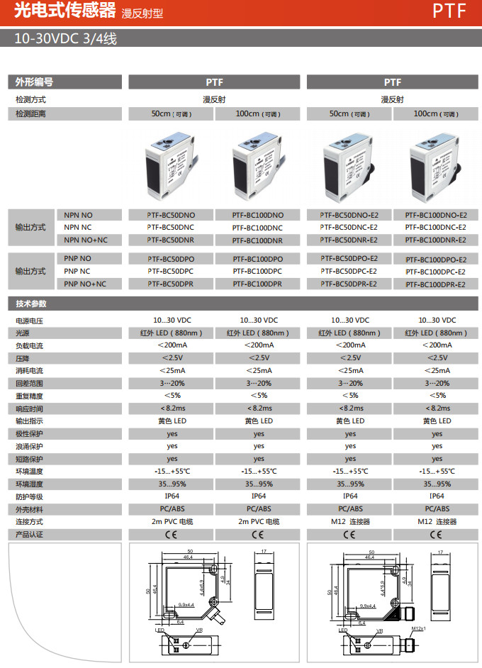 PTF-BC50DNO,PTF-BC50DNC,PTF-BC50DNR,PTF-BC50DPO,PTF-BC50DPC,PTF-BC50DPR,PTF-BC100DNO,光電式傳感器