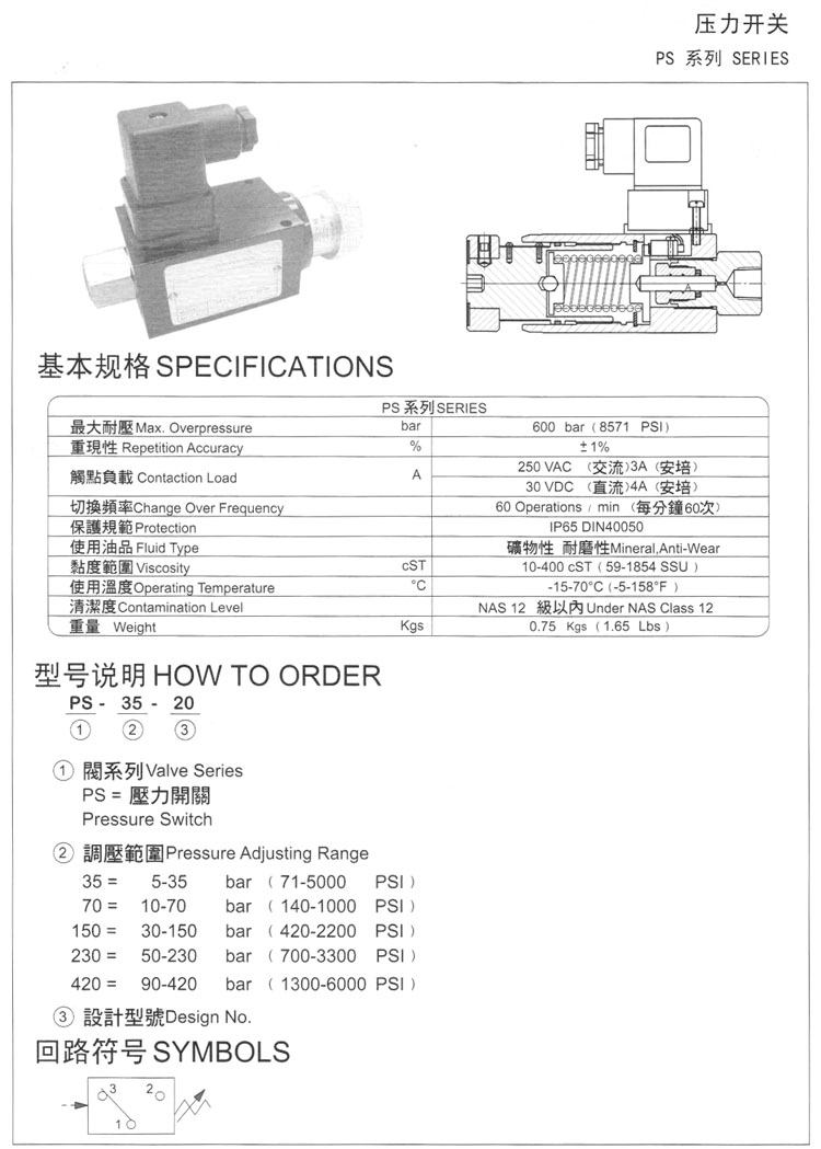 產(chǎn)品: 瀏覽次數(shù):597PS-35-20,PS-70-20,PS-150-20,PS-230-20,PS-420-20,壓力開關(guān)