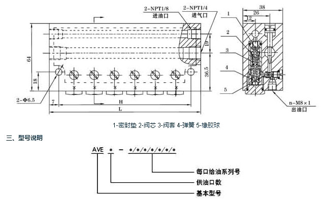 從進油口處進入的壓力油,在油壓的作用下件1下移,緊貼在件2上端面封住了通油通道,同時打開了進油通道向件3上腔充油,件3在油壓作用下克服件4彈簧力向下移動,則件3下腔的油頂開件5進入混合腔,在壓縮空氣的作用下經混合后的油氣從油氣出口排出。供油主管卸荷后,件1上部油壓低并且件3在件4的作用下向上回位,件3上腔充入的油經已打開的件2上端面流道孔進入件3下腔儲存,為下一循環(huán)供油作好準備。各口的供氣量可通過節(jié)流螺絲的開口大小進行調節(jié)。