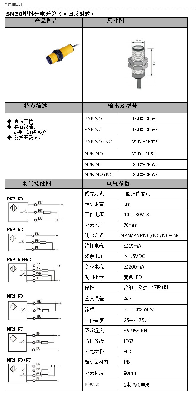 詳細信息 GSM30-DH5P1,GSM30-DH5P2,GSM30-DH5P3,GSM30-DH5N2,GSM30-DH5N3,SM30光電(回歸反射)
