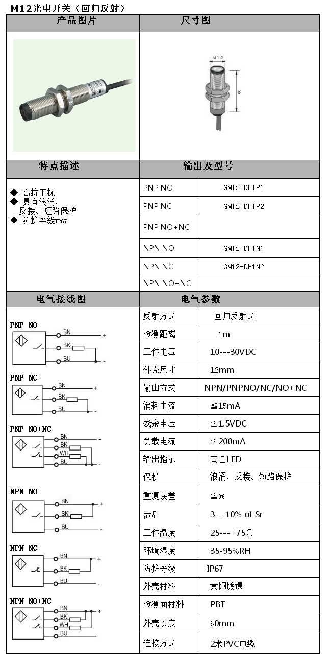 詳細(xì)信息 GM12-DH1P1,GM12-DH1P2,GM12-DH1N1,GM12-DH1N2,M12光電(回歸反射)