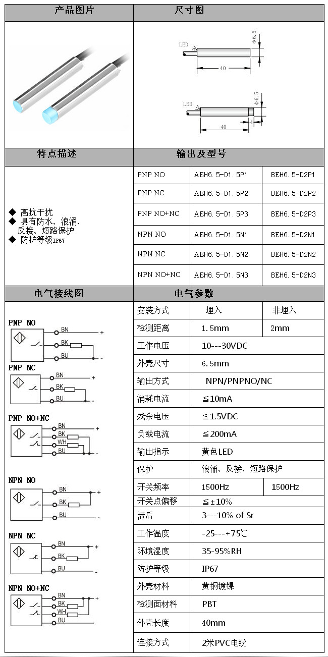 AEH6.5-D1.5P1,BEH6.5-D2P1,BEH6.5-D2P2,BEH6.5-D2N2,BEH6.5-D2N3,Φ6.5直流三線電感式接近開關(guān)