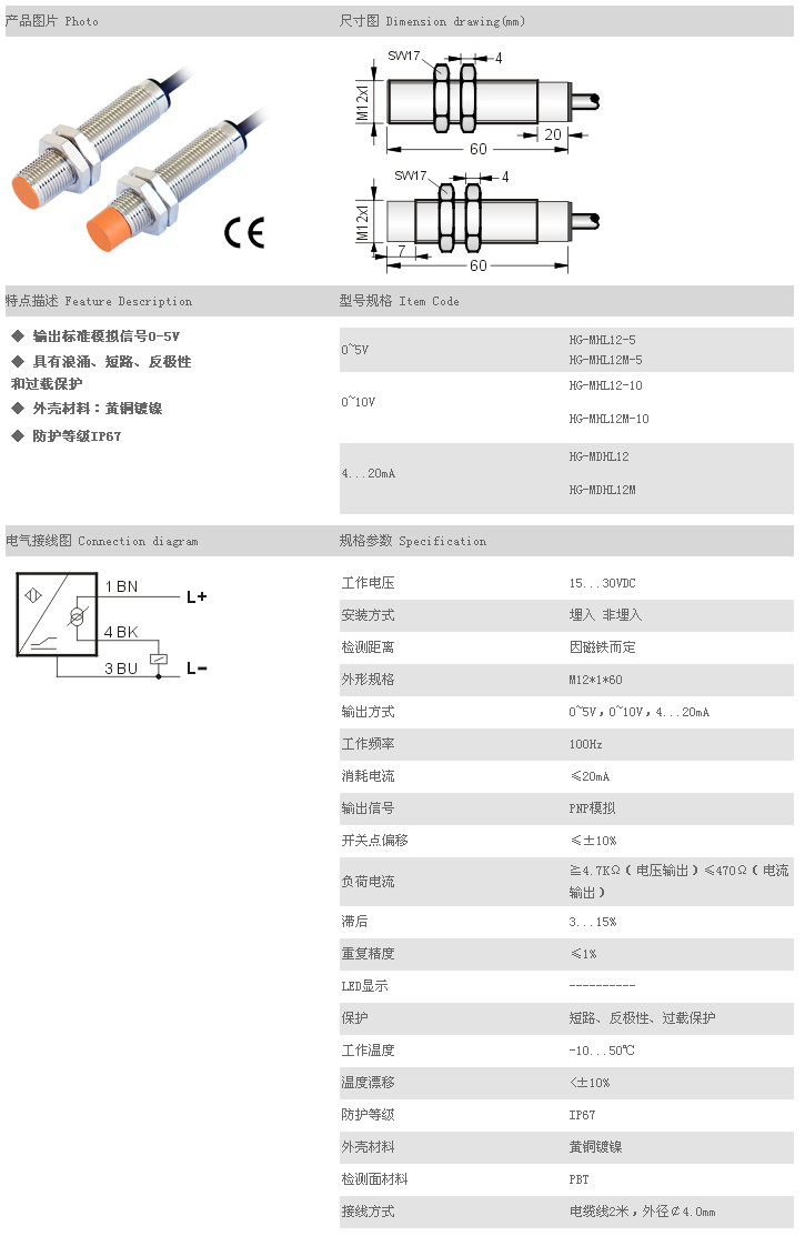 霍爾式線性傳感器 HG-MHL12-5,HG-MHL12M-5,HG-MHL12-10,HG-MHL12M-10,HG-MDHL12,HG-MDHL12M,