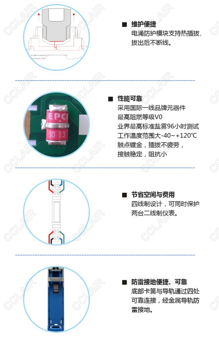 24V信號SPD,三線制、四線制,適用于線對地隔離電壓<500V信號回路,最大放電電流Imax(8/20us):20kA/線,12.5mm超薄,通過DIN35金屬導(dǎo)軌接地。