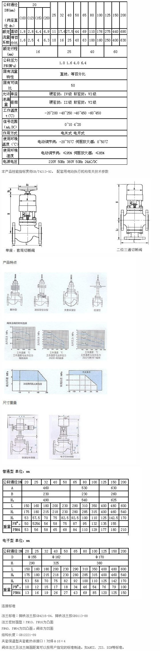 本系列產(chǎn)品公稱通徑由20至200mm,公稱壓力有1.0、1.6、4.0、6.4MPa,使用溫度范圍由-40℃~450℃,接受信號為0~10mA.DC或4~20mA.DC。其中電動單座調(diào)節(jié)閥適用于壓差較小,介質(zhì)粘度較大或稍有顆粒雜質(zhì)場合。電動套筒調(diào)節(jié)閥適用于壓差較大場合。按閥內(nèi)件密封部分材質(zhì)分又有金屬-金屬和非金屬-金屬密封兩種,后者閥關(guān)閉時泄漏量可達(dá)VI級(零泄漏)標(biāo)準(zhǔn)。按填料不同可分為一般填料密封和波紋管密封兩種,前者用一般場合,而后者用至不允許外漏的重要場合。流量特性為線性或等百分比。配用不同的執(zhí)行機(jī)構(gòu)可分為普通型和電子型兩種。多種多樣的品種規(guī)模可供選擇。