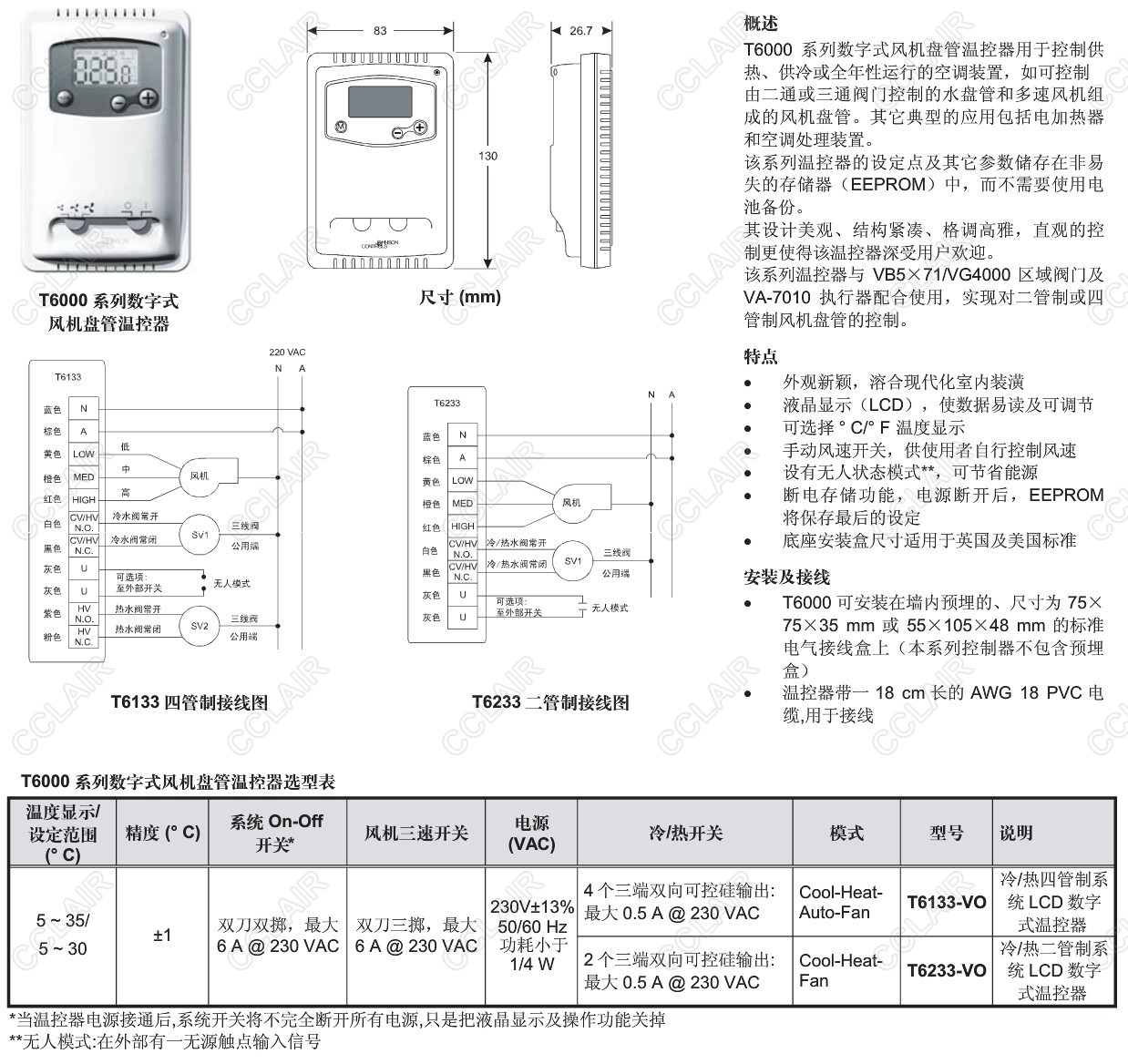 T6133-VO,T6233-VO,T6000,數(shù)字式風(fēng)機盤管溫控器