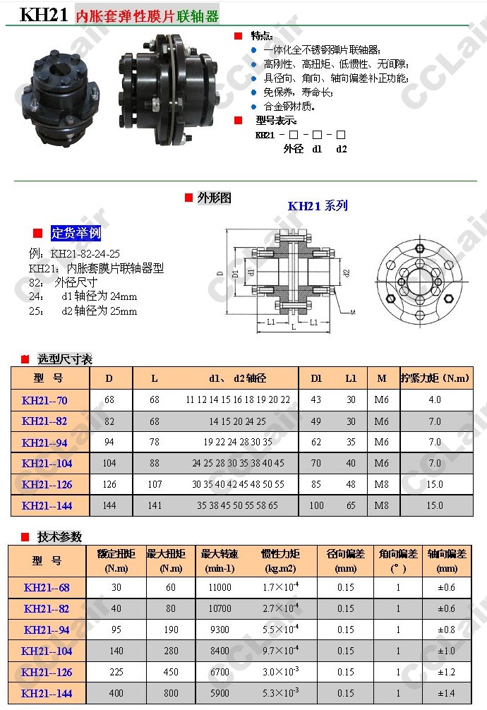 KH21-70,KH21-82,KH21-94,KH21-104,KH21-126,KH21-144,內(nèi)脹套彈性膜片聯(lián)軸器