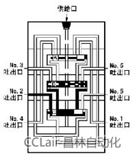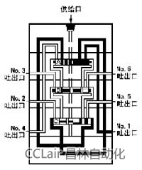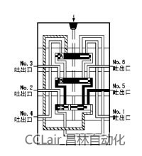 5、流入的潤滑劑推動活塞C向右移動、右腔的潤滑劑壓向NO.4吐出口經(jīng)外部配管送向潤滑點。當活塞C運動至右極限時活塞B左腔開始進入潤滑劑。
