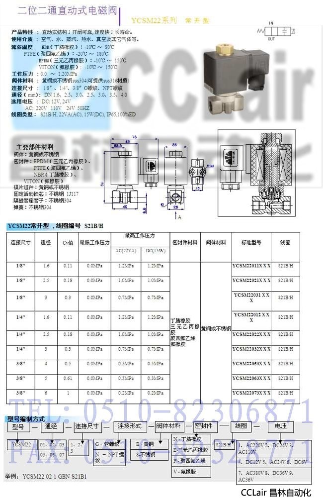 YCSM22071,YCSM22072,YCSM22073,YCSM22063,二位二通直動式電磁閥