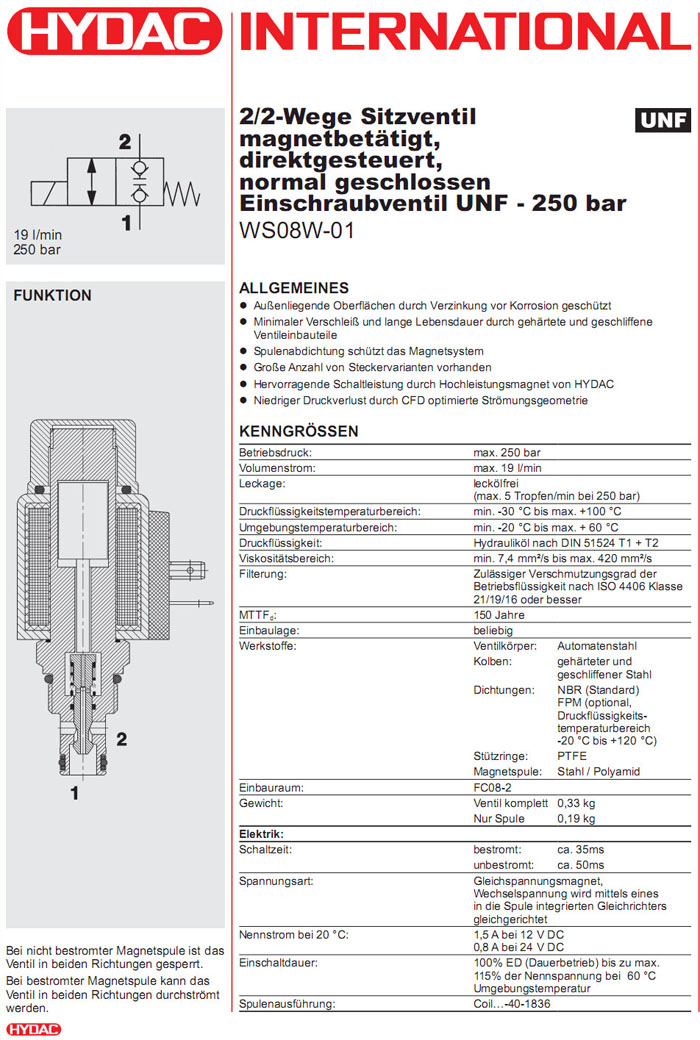 WS08W-01-C-N-24DG,WS08W-01-C-N-230AG,HYDAC電磁2/2方向座閥