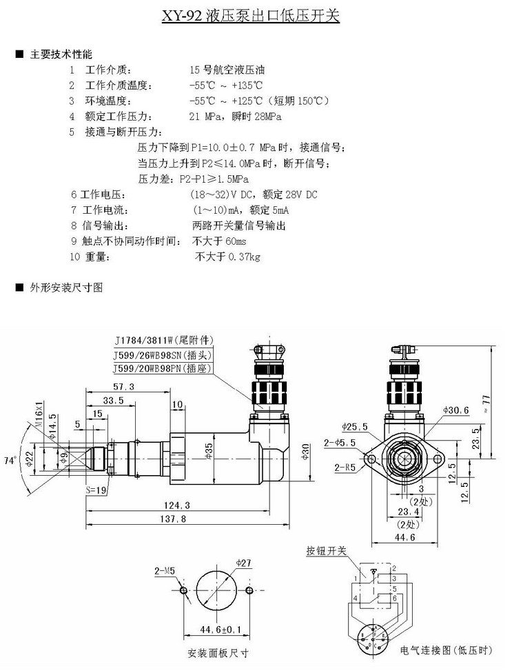 XY-92,液壓泵出口低壓開(kāi)關(guān)