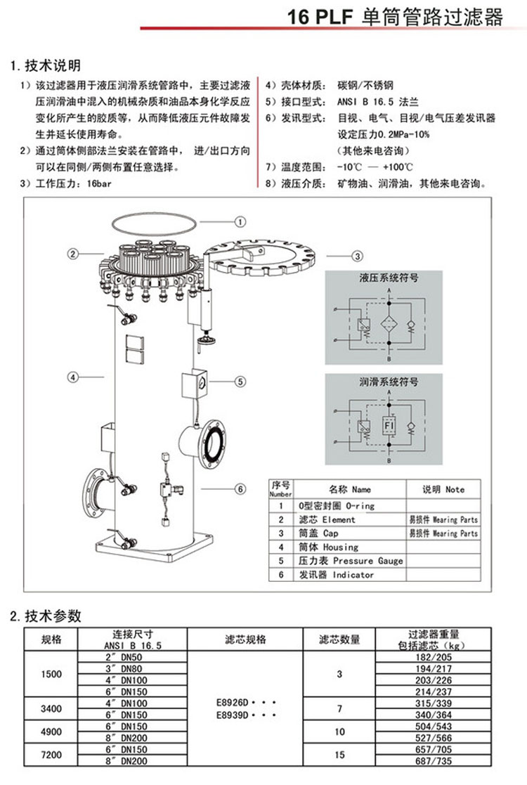 16PLF15,16PLF34,16PLF49,16PLF72,16PLF15T2602KN3,16PLF34T2604KN3,16PLF49T2608KN3,單筒管路過濾器
