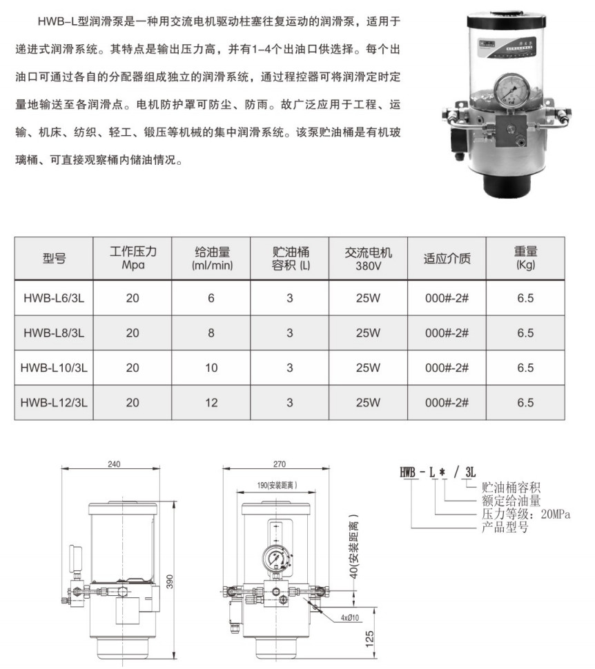 HWB-L6/3L,HWB-L8/3L,HWB-L10/3L,HWB-L12/3L,電動潤滑泵
