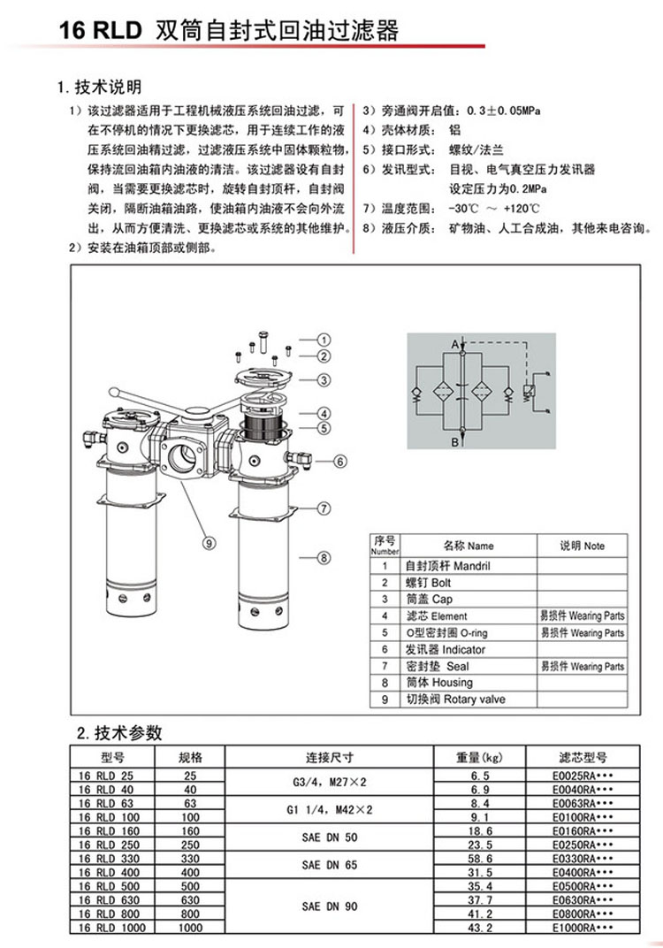 16RLD25,16RLD40,16RLD63,16RLD100,16RLD160,16RLD250,16RLD160KKN20ABP,雙筒自封式回油過濾器