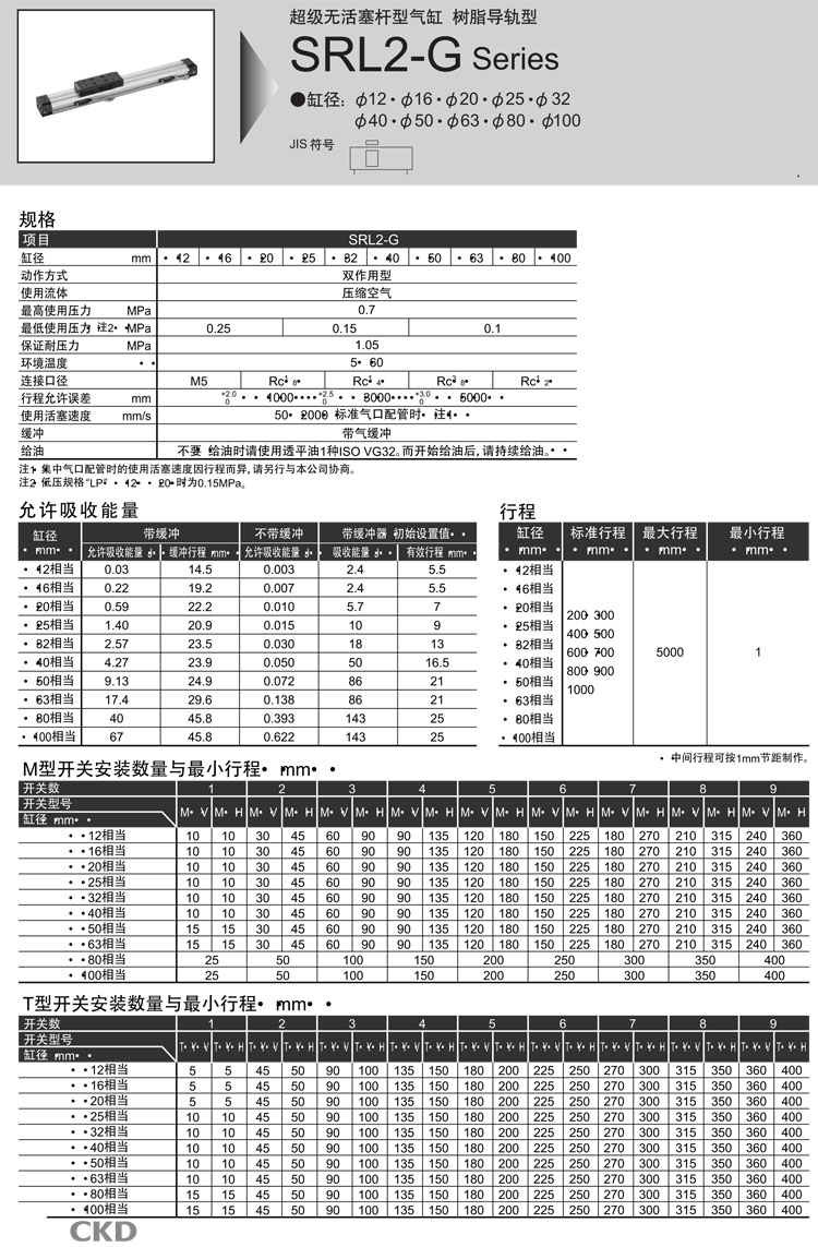 SRL2-G-00-12B-200,SRL2-G-LB-12B-200,SRL2-G-LB1-12B-200,SRL2-G-LB1-100B-700,CKD超級(jí)無(wú)活塞桿型氣缸