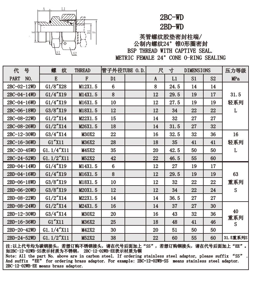 2BC-02-12WD,2BC-04-14WD,2BC-06-18WD,2BD-16-36WD,2BD-20-42WD,2BD-24-52WD,公制螺紋卡套接頭