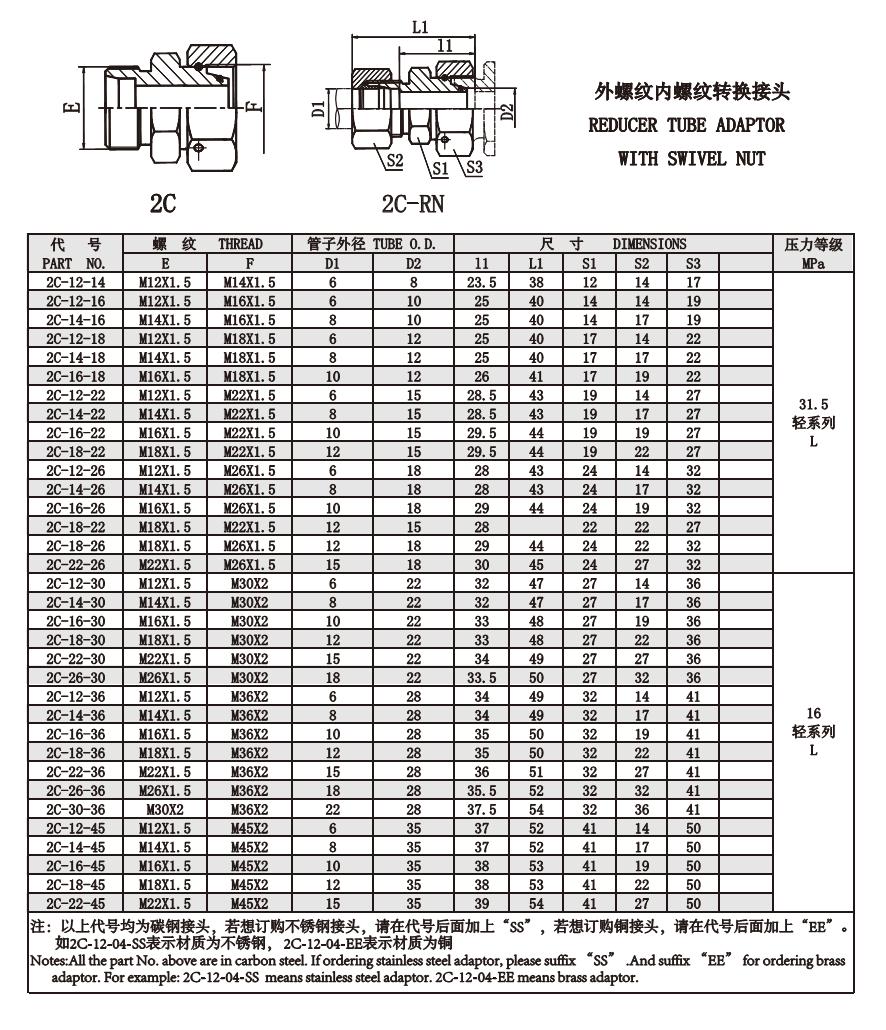 2C-12-14,2C-14-16,2C-16-22,2C-18-22,2C-22-30,2C-30-36,2C-45-52,2C-36-52,內螺紋轉換接頭