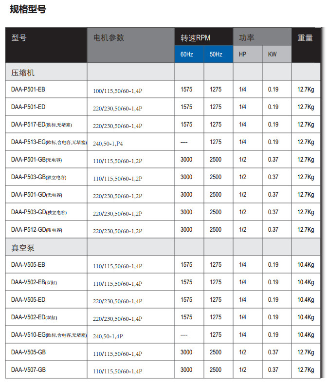 DAA-P501-EB,DAA-P501-ED,DAA-P517-ED,DAA-P513-EG,DAA-P501-GB,隔膜式真空泵/壓縮機 |