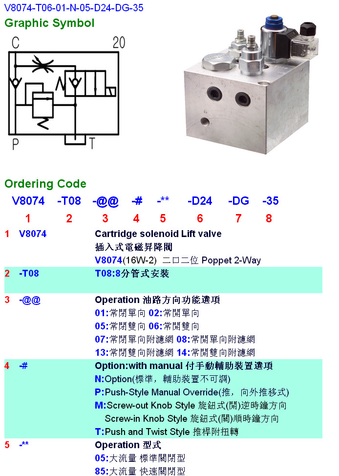 V8074-T06-02,V8074-T06-05,V8074-T06-06,V8074-T06-07,V8074-T06-01-N-05-D24-DG-35,HYDROMAX插入式電磁升降閥