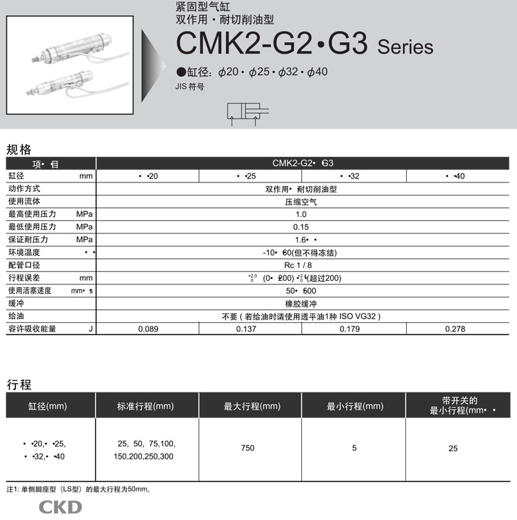 CMK2-G3-00-20-25,CMK2-G3-00-20-50,CMK2-G3-00-20-75,CMK2-G3-00-20-100,CMK2-G3-00-20-150,CKD緊固型氣缸