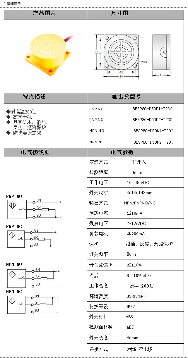 BESP80-D50P1-T200,BESP80-D50P2-T200,BESP80-D50N1-T200,BESP80-D50N2-T200,SP80耐高溫200℃接近開關(guān)